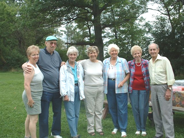 L to R: Susan Finbow, who is the oldest daughter of Gwen and Gordon Finbow Gordon Finbow who is a son of Jeannie (1894-1942) Margaret Francisco who is the oldest daughter of Iris Roper who is a daughter of Margaret, one of the originals who came from Scotland. Helen Nicolle who is a daughter of Florence who is a daughter of Jeannie (1894-1942) Joan Davies is the daughter of John Wright (b:? d:?) who went with his father James Marshall Wright to South Africa Iris Roper daughter of Margaret (1892-1940) who was one of the original four from Scotland to Ontario in 1909 Douglas Wright who is a son of Thomas (1898-1969) another of the original four that came to Canada in 1910 from Scotland |