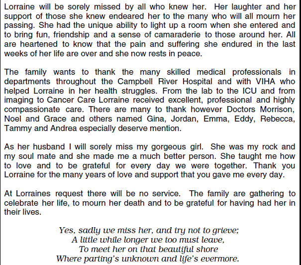 "Gone to be with her Mom and Dad, brother Neil and her many other Angels"