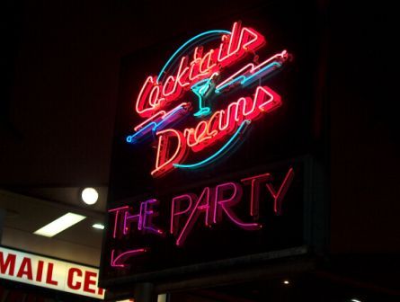 at night, Cocktails and Dreams. a bar down the street (which shares the name
